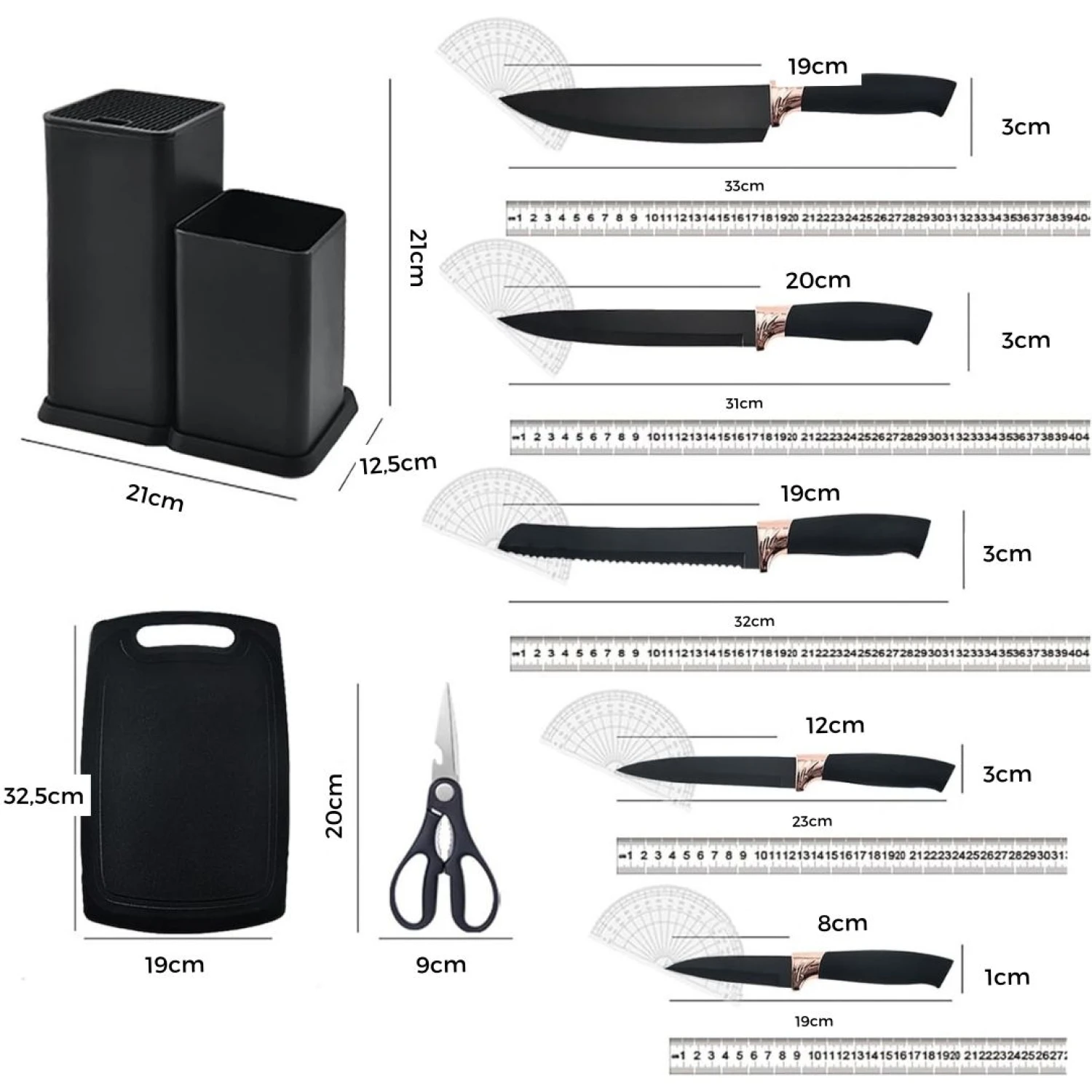 - Organización perfecta: El soporte incluido permite almacenar los cuchillos y utensilios de manera vertical, optimizando el espacio en la cocina y manteniéndolos siempre a mano.