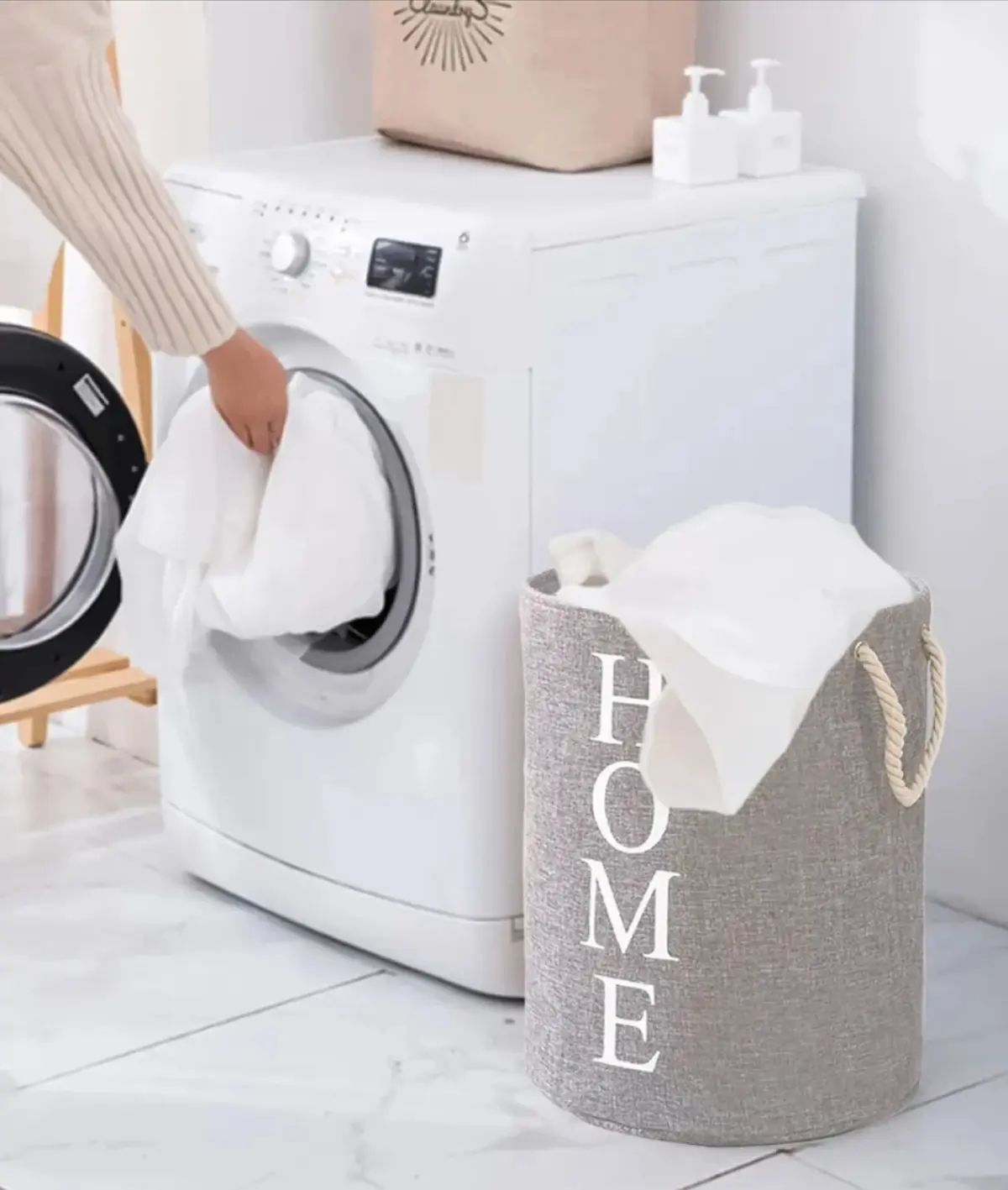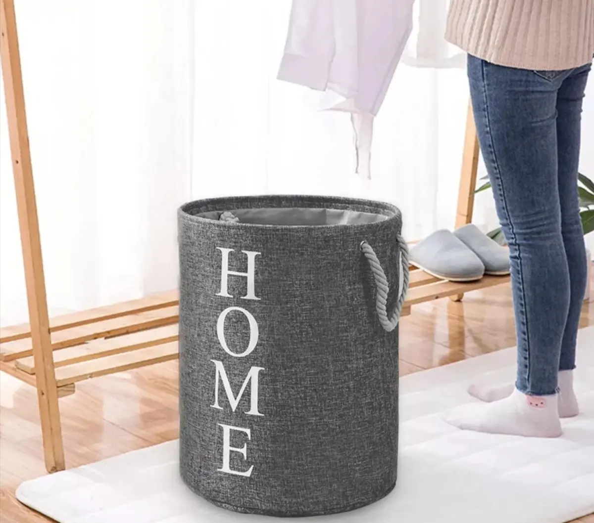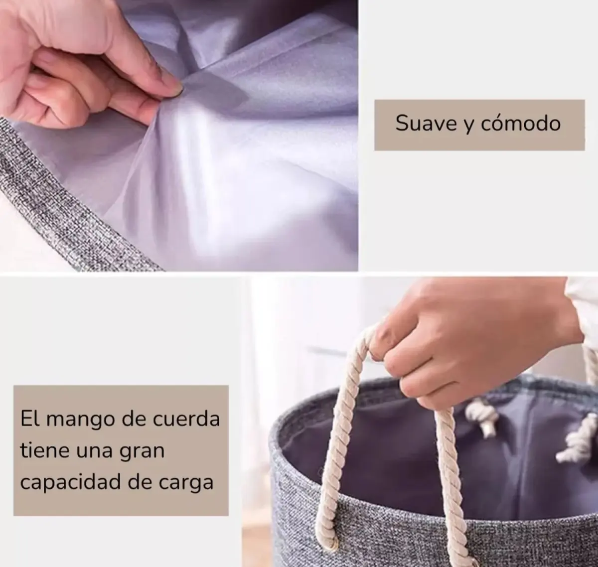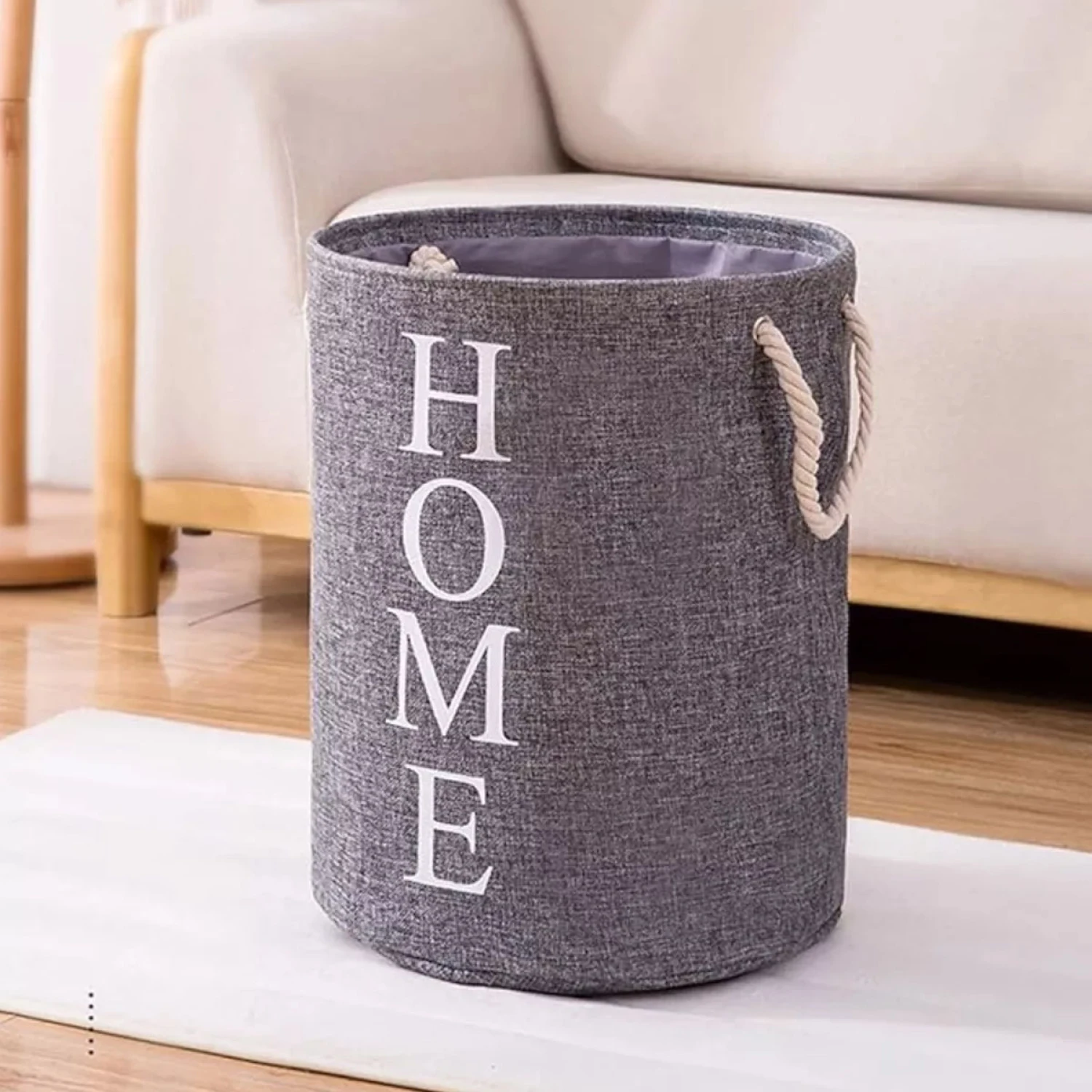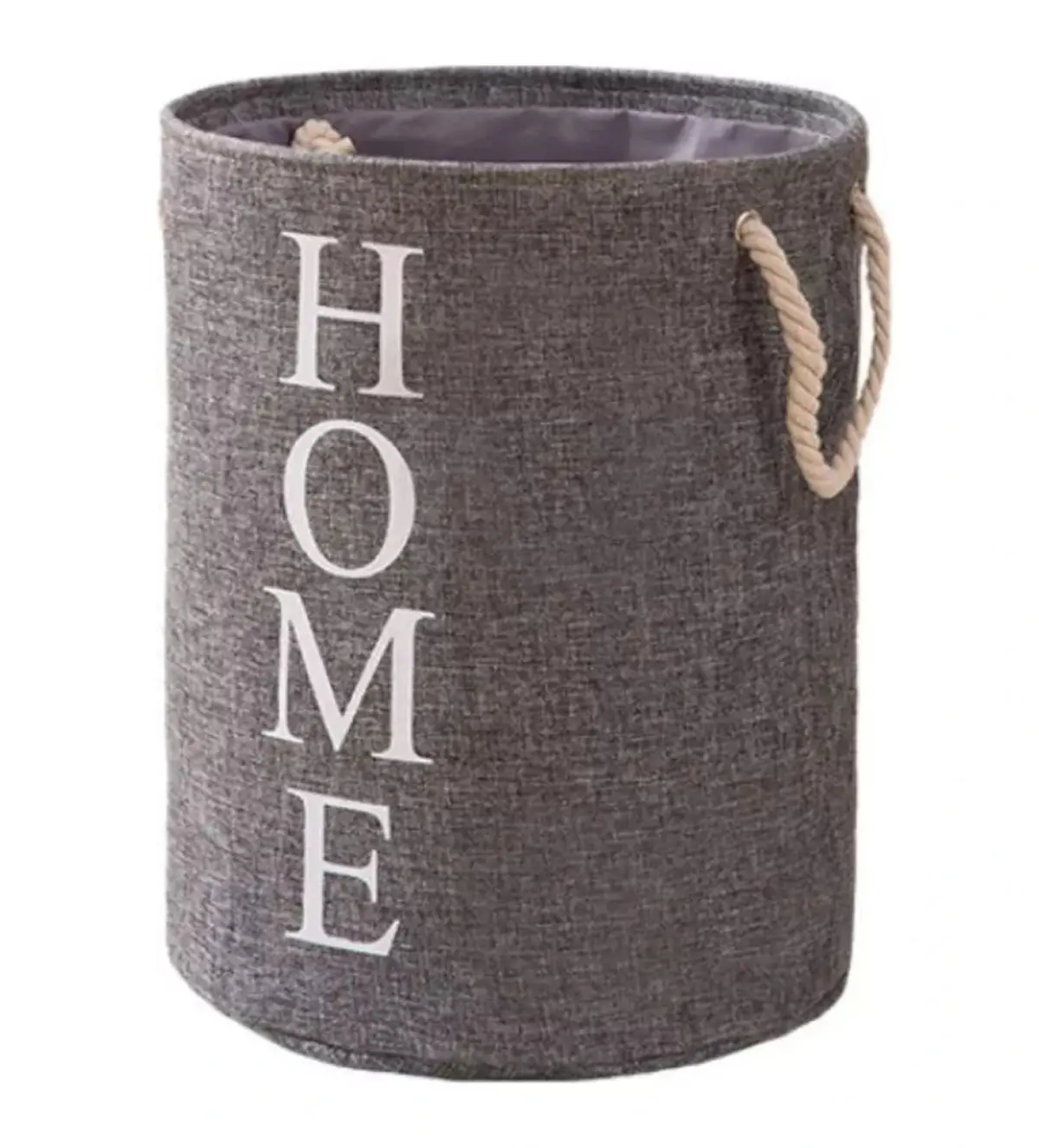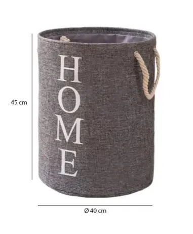 BOLSA DE LAVANDERIA CIRCULAR CON ASAS - Diseño circular, moderno, elegante y funcional - Ideal para almacenar artículos de lavandería como la ropa sucia o los juguetes de los pequeños, y así mantener la limpieza y el orden en tus espacios, ya sea en el dormitorio, living baño - Plegable, liviana, portable - Gran capacidad de almacenamiento de ropa - Con 2 asas para fácil transporte Especificaciones: - Material: Tela en algodón y lino, asas en cuerda con diseño trenzado - Medidas: diámetro 40cm x 45cm de alto - Peso: 400 gr - Colores: Gris oscuro