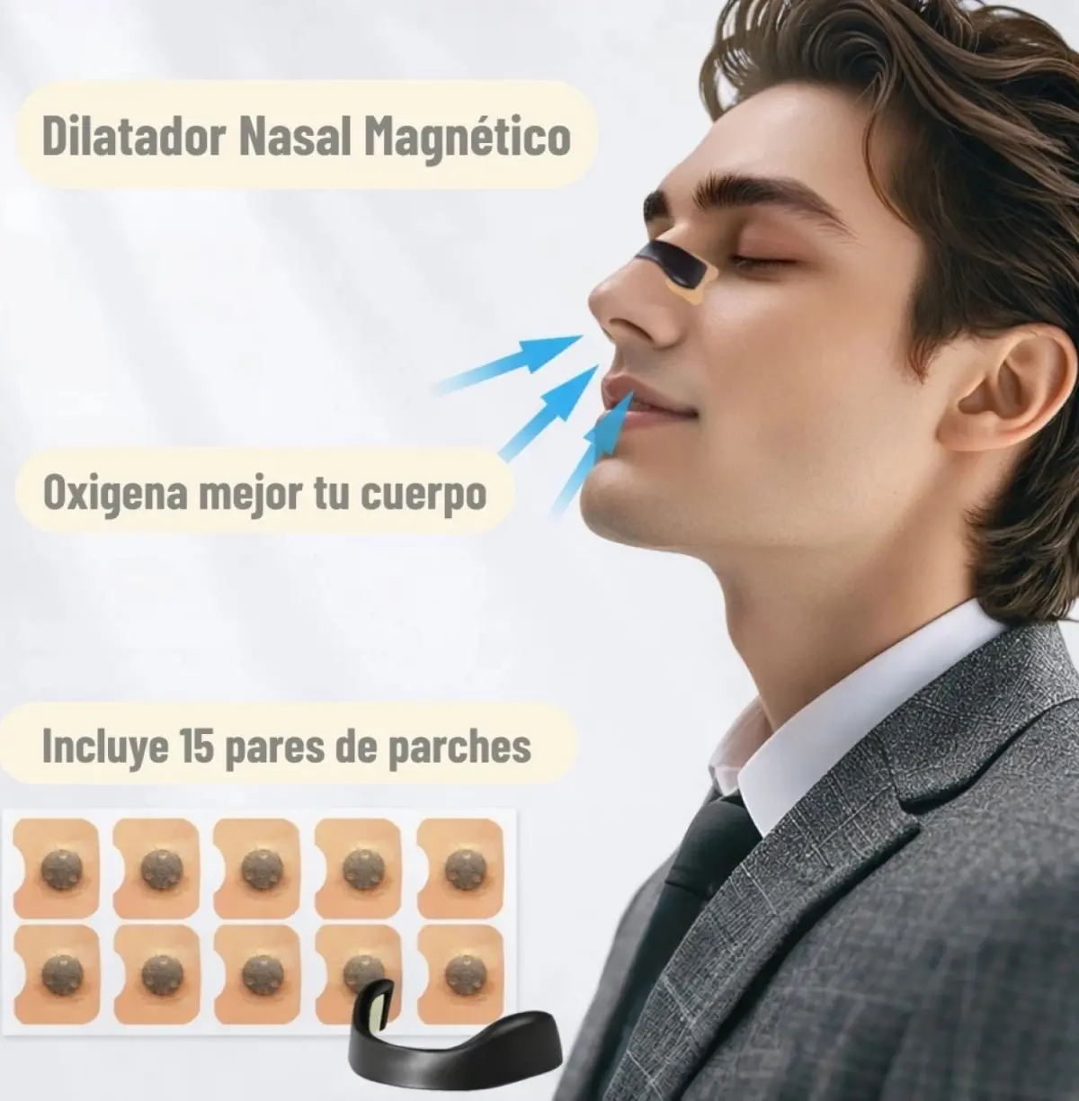Colocar el parche adhesivo sobre la nariz limpia y seca utilizando el aplicador magnético. Luego fijar el dilatador elegido según el tamaño más cómodo. Retirar al finalizar el uso y reemplazar el parche cuando pierda adherencia.