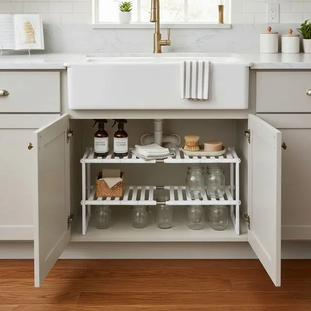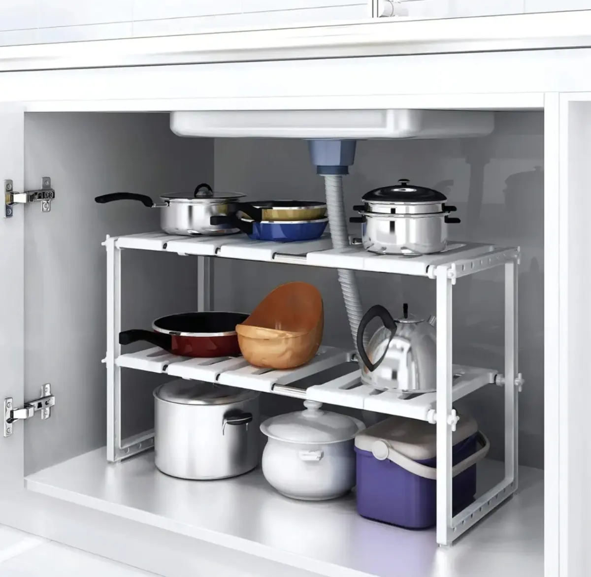 - Ancho ajustable: Este organizador puede expandirse entre 50 cm y 70 cm, adaptándose a diferentes tamaños de espacios, ya sea en encimeras, bajo el fregadero o dentro de armarios.