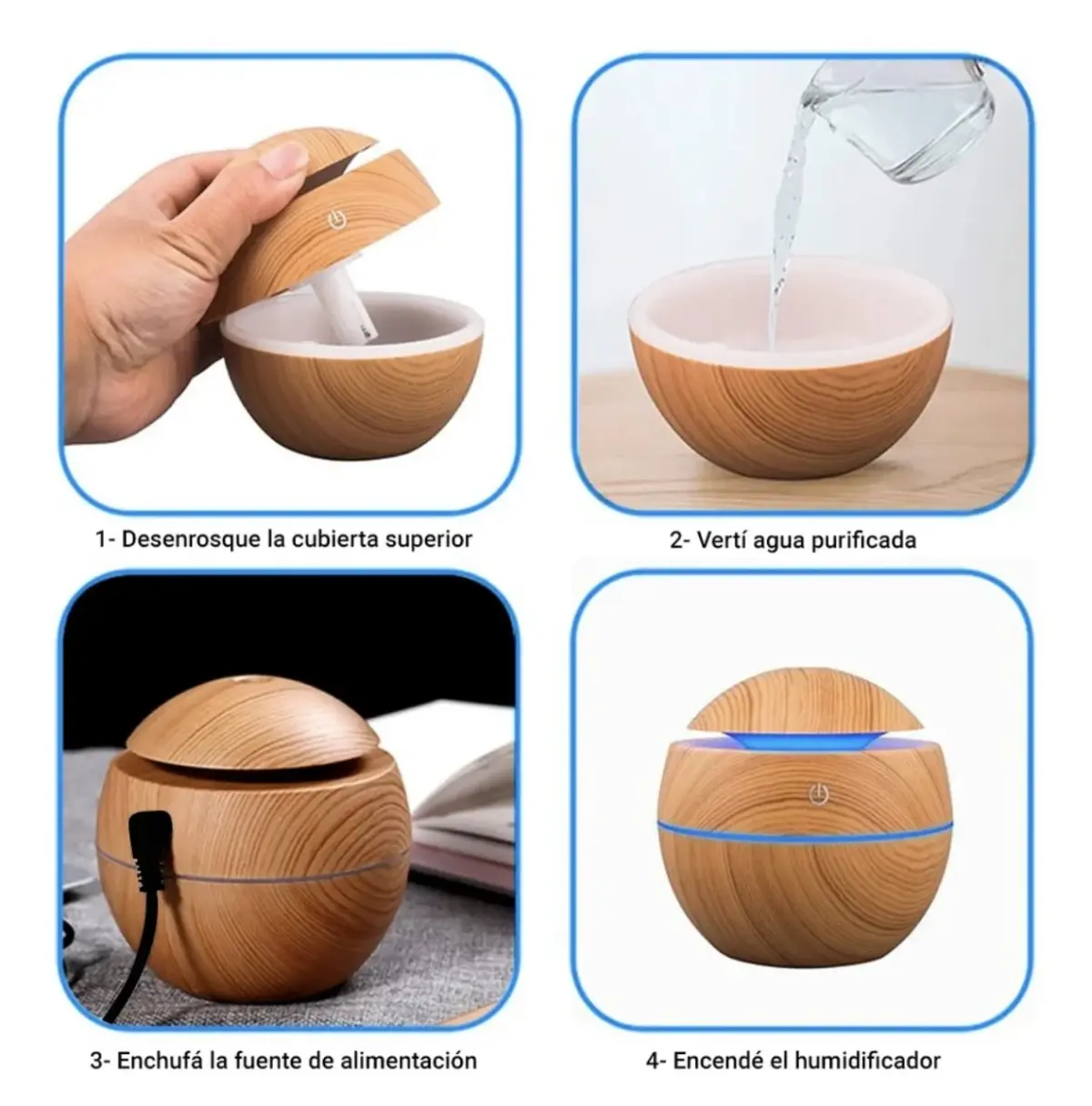 Posee una capacidad de 200ml en el tanque, diseño portátil y versátil. Se puede añadir aceites esenciales a tu elección. Posee 6 colores de luces Led qué puedes elegir.