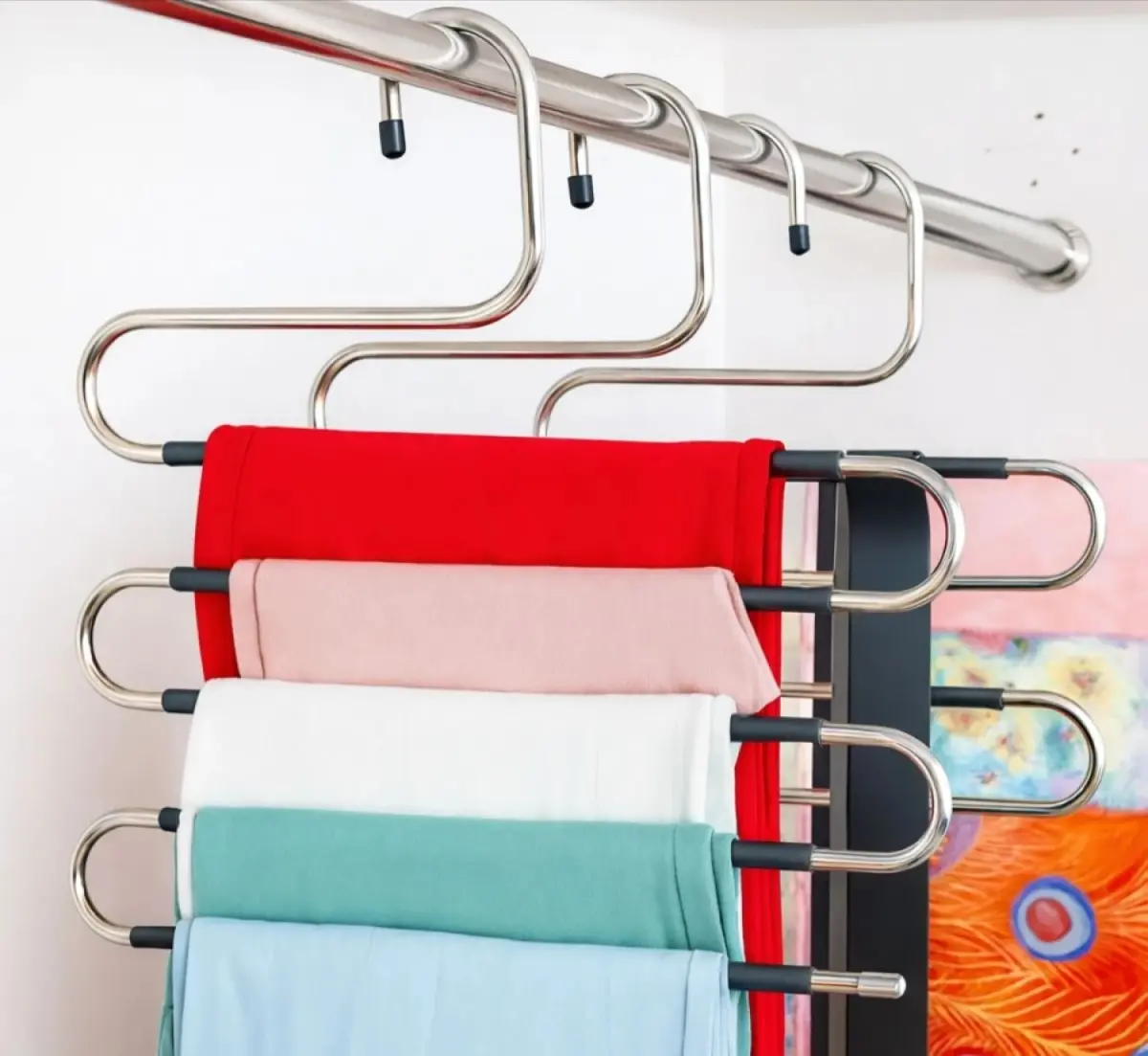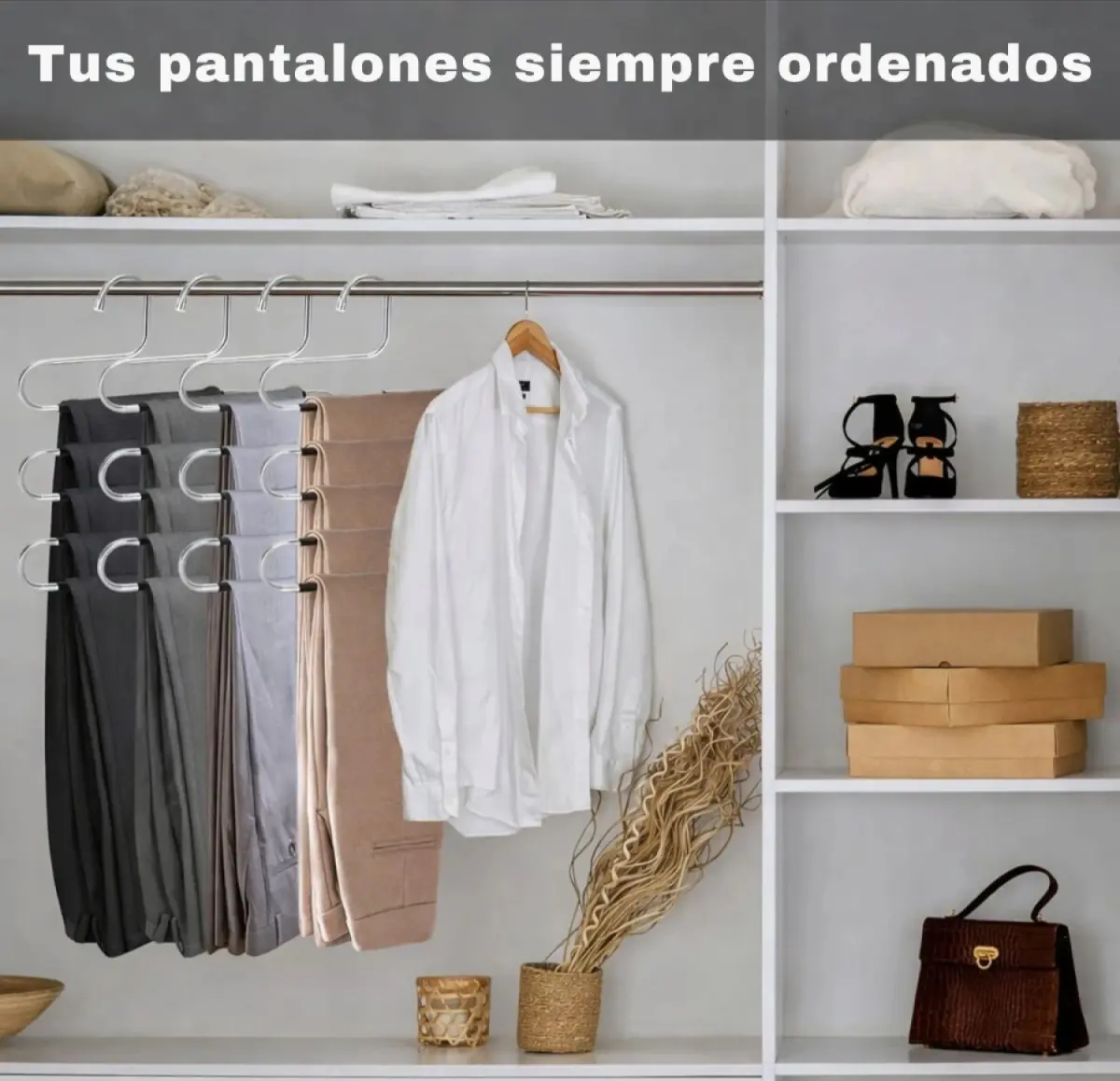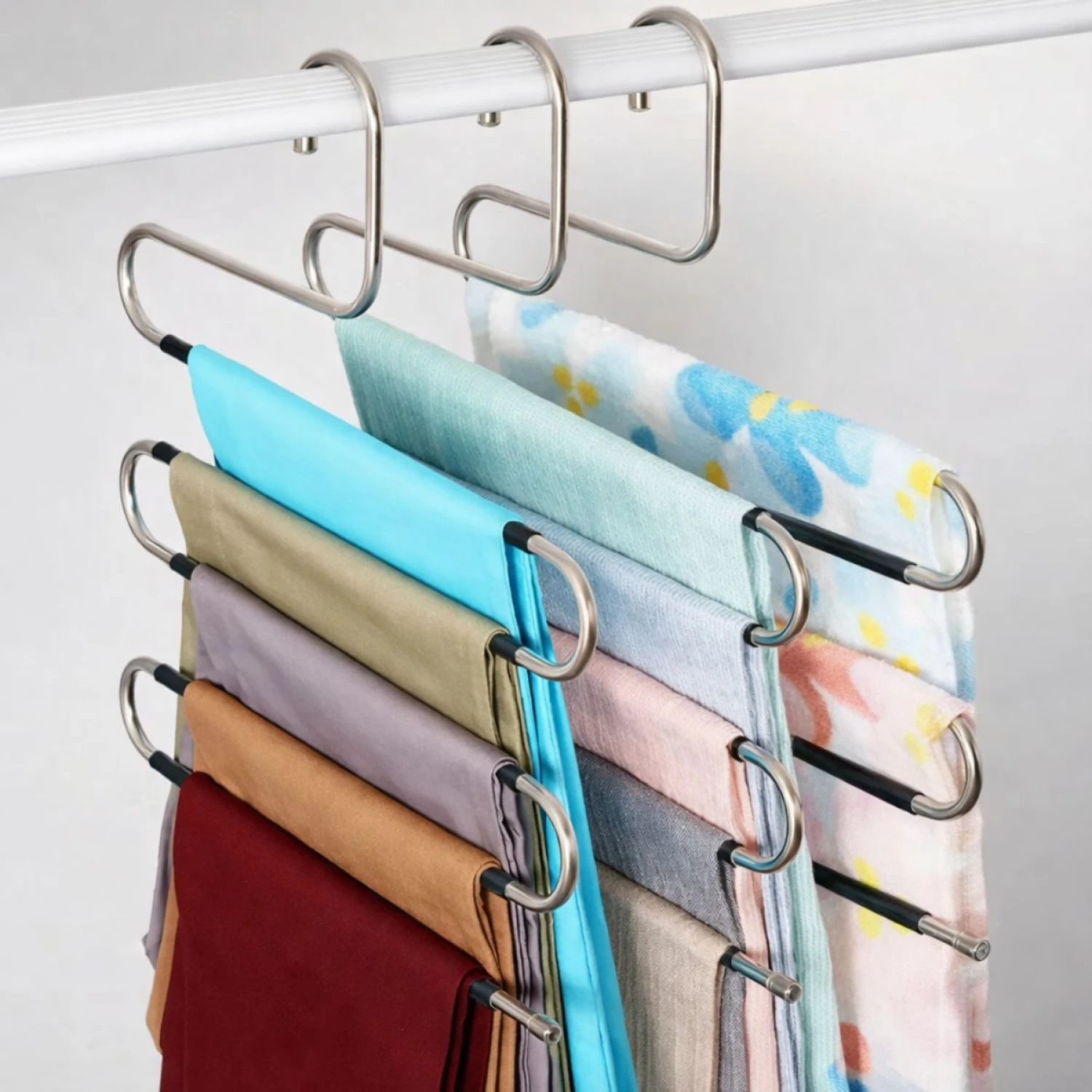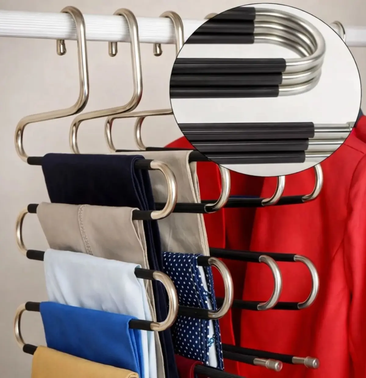 Percha organizadora multiuso diseñada para colgar hasta 5 pantalones en un sola percha, ideal para maximizar el espacio del armario sin arrugar la ropa. Fabricada en acero inoxidable de alta resistencia, incorpora recubrimiento antideslizante que mantiene las prendas firmes y prolijas. Apta para pantalones, jeans, calzas, polleras, bufandas y prendas similares. Su diseño robusto evita deformaciones incluso con uso diario. Capacidad para 5 pantalones, permite ordenar varias prendas en un solo punto del placard. Estructura de acero inoxidable, resistente a la corrosión y al peso, ideal para larga duración. Recubrimiento de PVC antideslizante, evita que la ropa se deslice o se marque. Diseño rígido reforzado, no se dobla fácilmente incluso con pantalones pesados. Ganchos con tapas protectoras, cuidan la ropa y evitan rayar el barral. Medidas aproximadas: Alto: 39 cm Ancho: 32 cm Separación por nivel: 5 cm