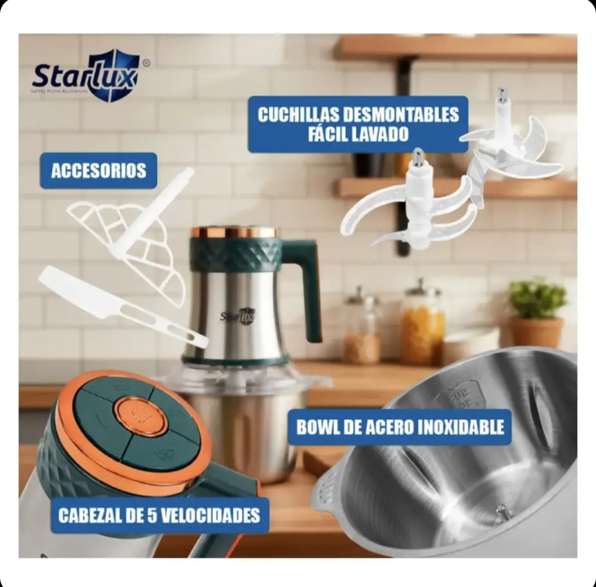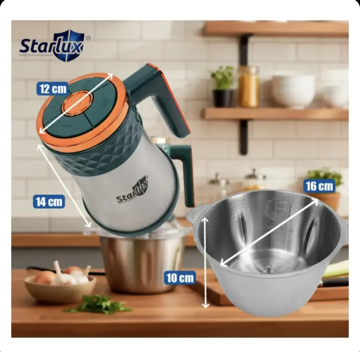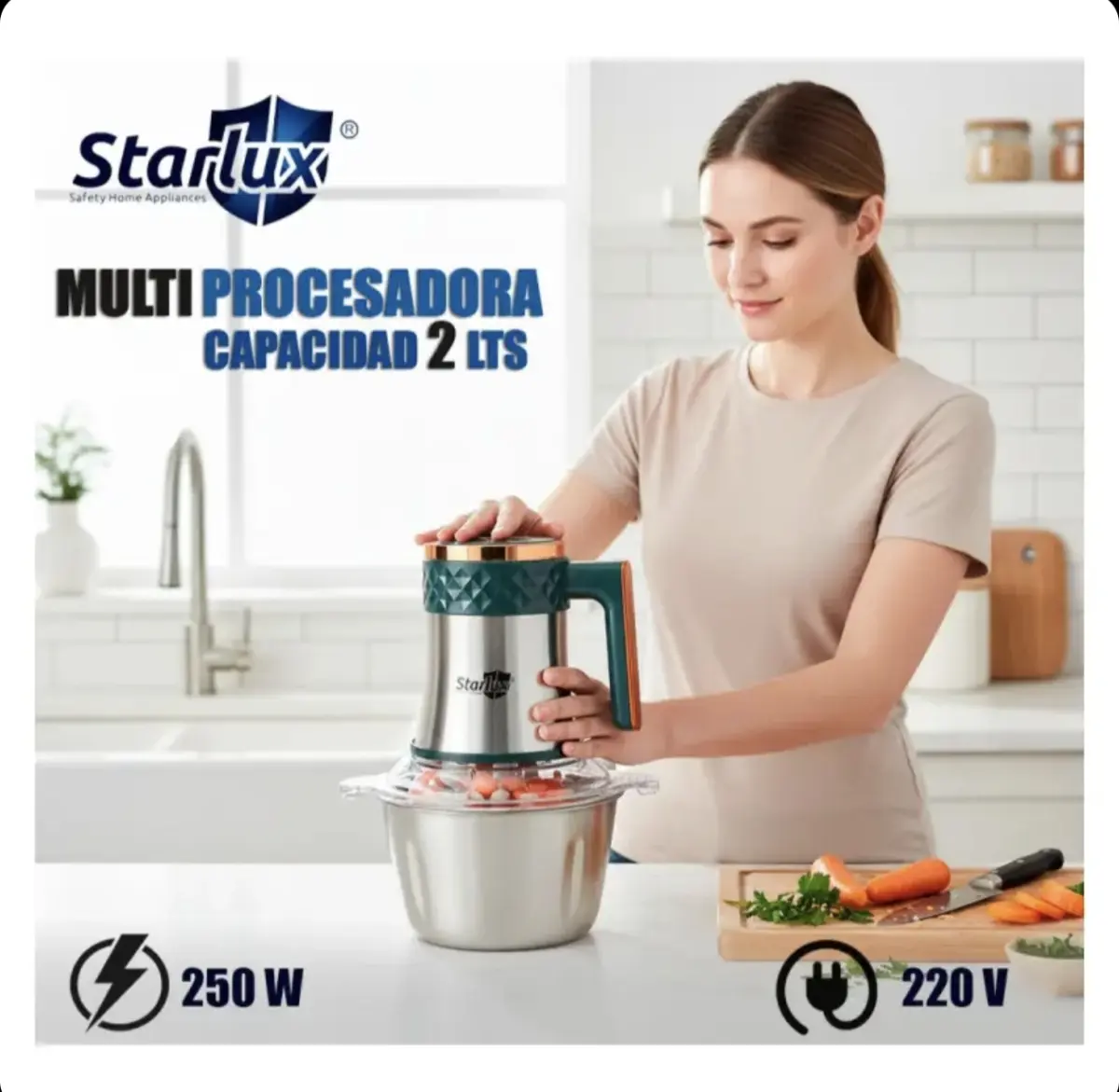 La procesadora picadora eléctrica Starlux SL-28044G es la herramienta ideal para quienes buscan eficiencia y versatilidad en la cocina. Con una potencia de 250 W y una capacidad de 2 litros, permite picar carne y verduras de manera rápida y uniforme, facilitando la preparación de tus platillos favoritos.