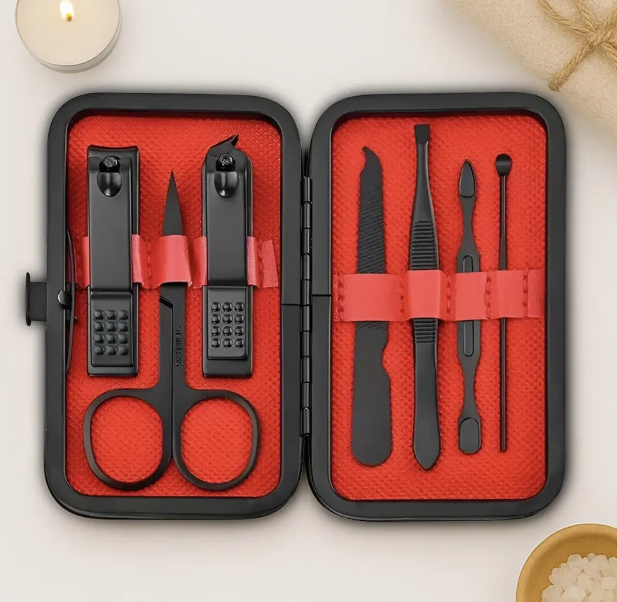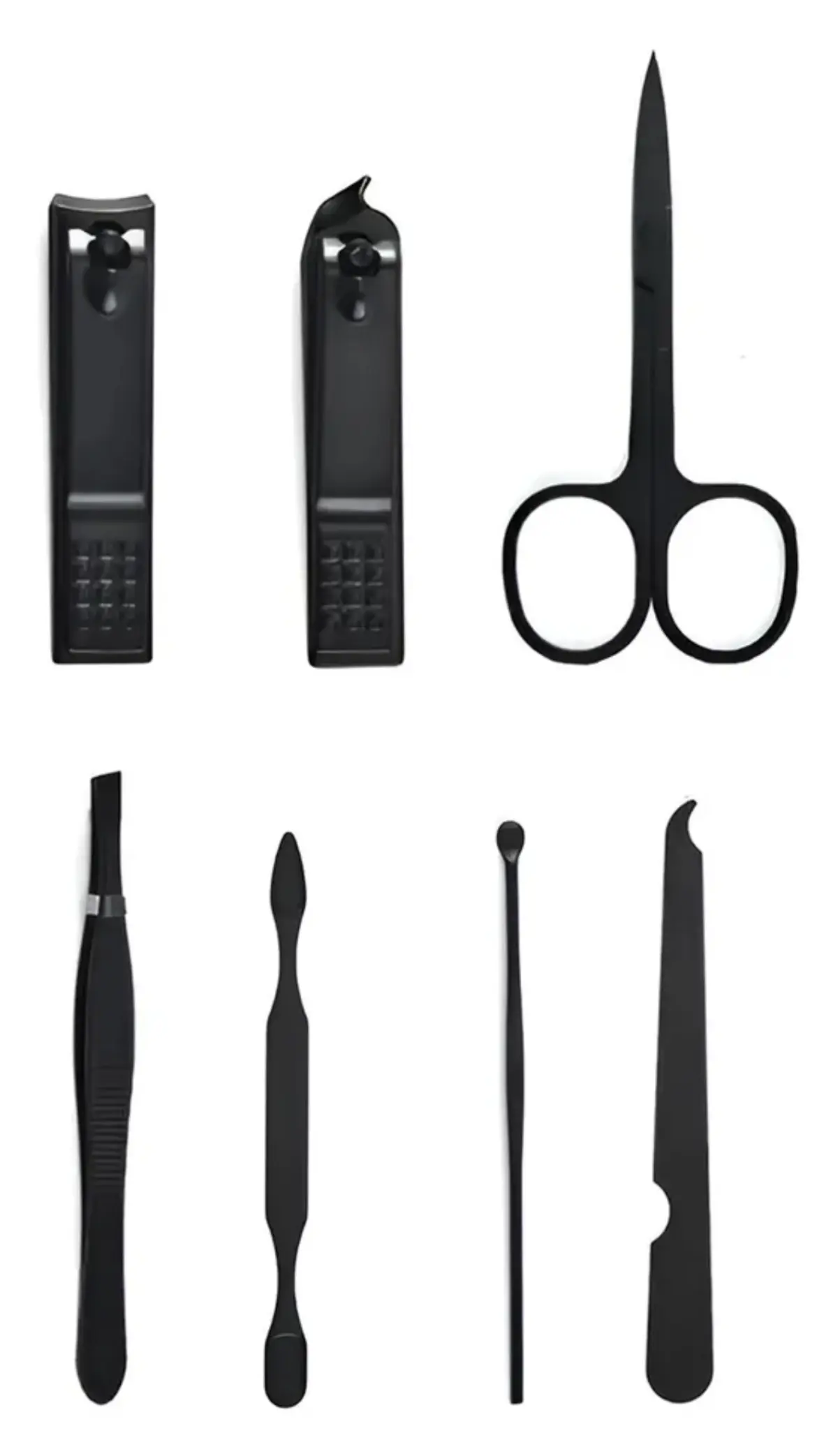 Incluye · Cortaúñas grande · Cortaúñas oblicuo · Tijera · Lima · Pinza para cejas · Empujador de cutícula · Limpiador de oídos tipo cuchara