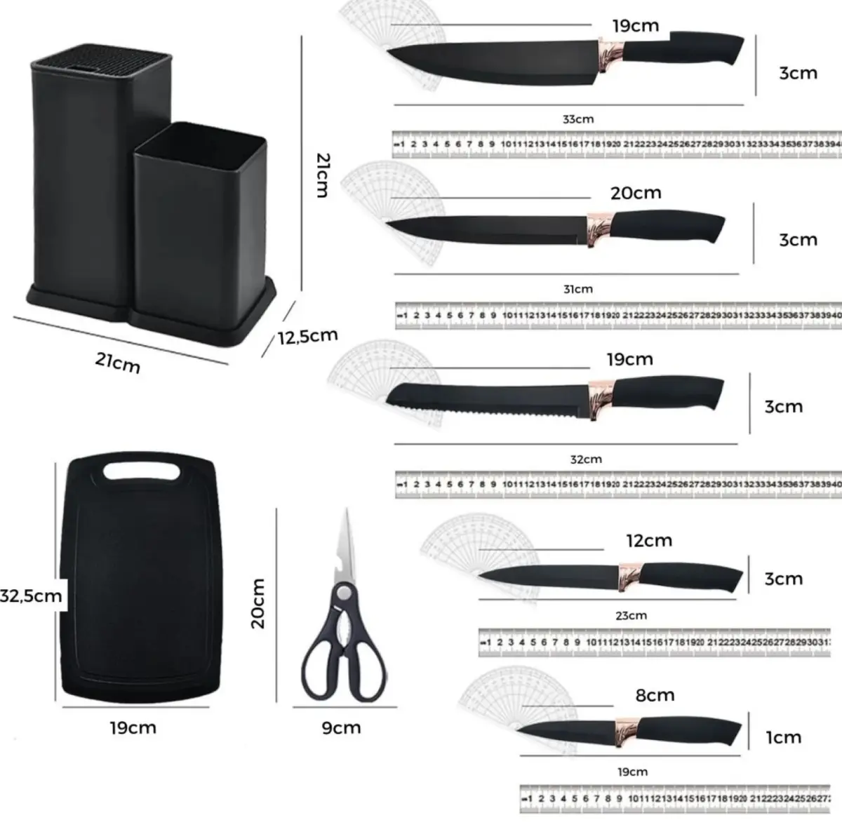 - Organización perfecta: El soporte incluido permite almacenar los cuchillos y utensilios de manera vertical, optimizando el espacio en la cocina y manteniéndolos siempre a mano.